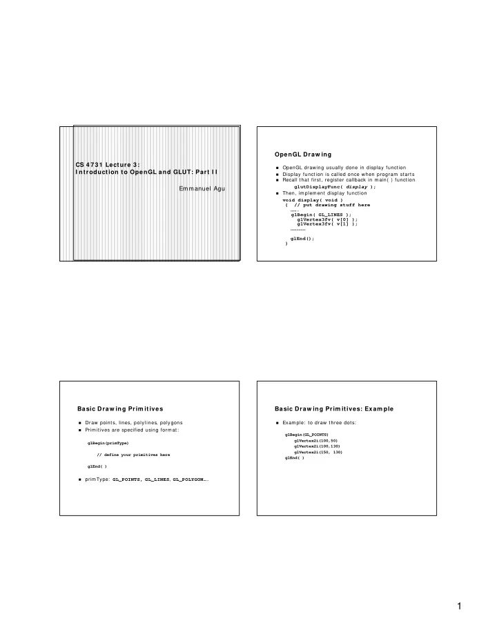 OpenGL Draw ing CS 4 7 3 1 Lecture 3 : � OpenGL drawing usually done in display function I ntroduction to OpenGL and GLUT: Part I I � Display function is called once when program starts � Recall that first, register callback in m ain( ) function glutDisplayFunc( display ); Emmanuel Agu � Then, im plem ent display function void display( void ) { // put drawing stuff here ……. glBegin( GL_LINES ); glVertex3fv( v[0] ); glVertex3fv( v[1] ); …………… glEnd(); } Basic Draw ing Prim itives Basic Draw ing Prim itives: Exam ple � Draw points, lines, polylines, polygons � Exam ple: to draw three dots: � Prim itives are specified using form at: glBegin(GL_POINTS) glVertex2i(100,50) glBegin(primType) glVertex2i(100,130) glVertex2i(150, 130) // define your primitives here glEnd( ) glEnd( ) � primType: GL_POINTS, GL_LINES , GL_POLYGON…. 1