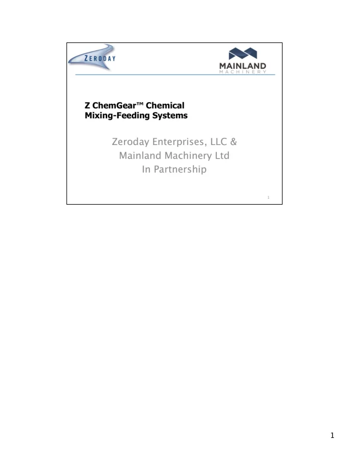 • Over his career Bill Hancock has worked for a range of companies including iron ore and uranium operations to technical chemical and equipment sales companies. • Bill Hancock registered Zeroday March 2001 and is sole owner. • Originally focused on mineral process and water treatment consulting • Began selling primarily flocculants and coagulants, have sold commodities but not a focus, in the Pacific Northwestern USA and Alaska • In mid 2000’s began adding equipment and services to product line to support chemical sales: diaphragm pumps, peristaltic pumps, relabeled flocculant equipment from other manufactures • Due to disappointment with quality and operational inconsistencies, Bill began designing and building his own systems focused on ‘robust, highly consistent chemical systems that are built to last. • Developed a strategy to be a “one stop shop” for chemical mixing and feeding systems. 2