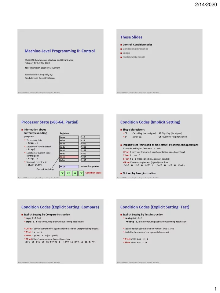 2/14/2020 These Slides Control: Condition codes Conditional branches Machine-Level Programming II: Control Loops Switch Statements CSci 2021: Machine Architecture and Organization February 17th-19th, 2020 Your instructor: Stephen McCamant Based on slides originally by: Randy Bryant, Dave O’Hallaron 1 2 Bryant and O’Hallaron, Computer Systems: A Programmer’s Perspective, Third Edition Bryant and O’Hallaron, Computer Systems: A Programmer’s Perspective, Third Edition Processor State (x86-64, Partial) Condition Codes (Implicit Setting) Information about Single bit registers currently executing CF Carry Flag (for unsigned) SF Sign Flag (for signed) Registers program ZF Zero Flag OF Overflow Flag (for signed) %rax %r8 Temporary data %rbx %r9 ( %rax , … ) %rcx %r10 Implicitly set (think of it as side effect) by arithmetic operations Location of runtime stack %rdx %r11 Example: addq Src , Dest ↔ t = a+b ( %rsp ) %rsi %r12 CF set if carry out from most significant bit (unsigned overflow) Location of current code %rdi %r13 ZF set if t == 0 control point %rsp %r14 ( %rip , … ) SF set if t < 0 (as signed; i.e., copy of sign bit) %rbp %r15 Status of recent tests OF set if two’s -complement (signed) overflow ( CF, ZF, SF, OF ) (a>0 && b>0 && t<0) || (a<0 && b<0 && t>=0) %rip Instruction pointer Current stack top Condition codes Not set by leaq instruction CF ZF SF OF 3 4 Bryant and O’Hallaron, Computer Systems: A Programmer’s Perspective, Third Edition Bryant and O’Hallaron, Computer Systems: A Programmer’s Perspective, Third Edition Condition Codes (Explicit Setting: Compare) Condition Codes (Explicit Setting: Test) Explicit Setting by Compare Instruction Explicit Setting by Test instruction cmpq Src2 , Src1 testq Src2 , Src1 cmpq b,a like computing a-b without setting destination testq b,a like computing a&b without setting destination CF set if carry out from most significant bit (used for unsigned comparisons) Sets condition codes based on value of Src1 & Src2 ZF set if a == b Useful to have one of the operands be a mask SF set if (a-b) < 0 (as signed) OF set if two’s -complement (signed) overflow ZF set when a&b == 0 (a>0 && b<0 && (a-b)<0) || (a<0 && b>0 && (a-b)>0) SF set when a&b < 0 5 6 Bryant and O’Hallaron, Computer Systems: A Programmer’s Perspective, Third Edition Bryant and O’Hallaron, Computer Systems: A Programmer’s Perspective, Third Edition 1