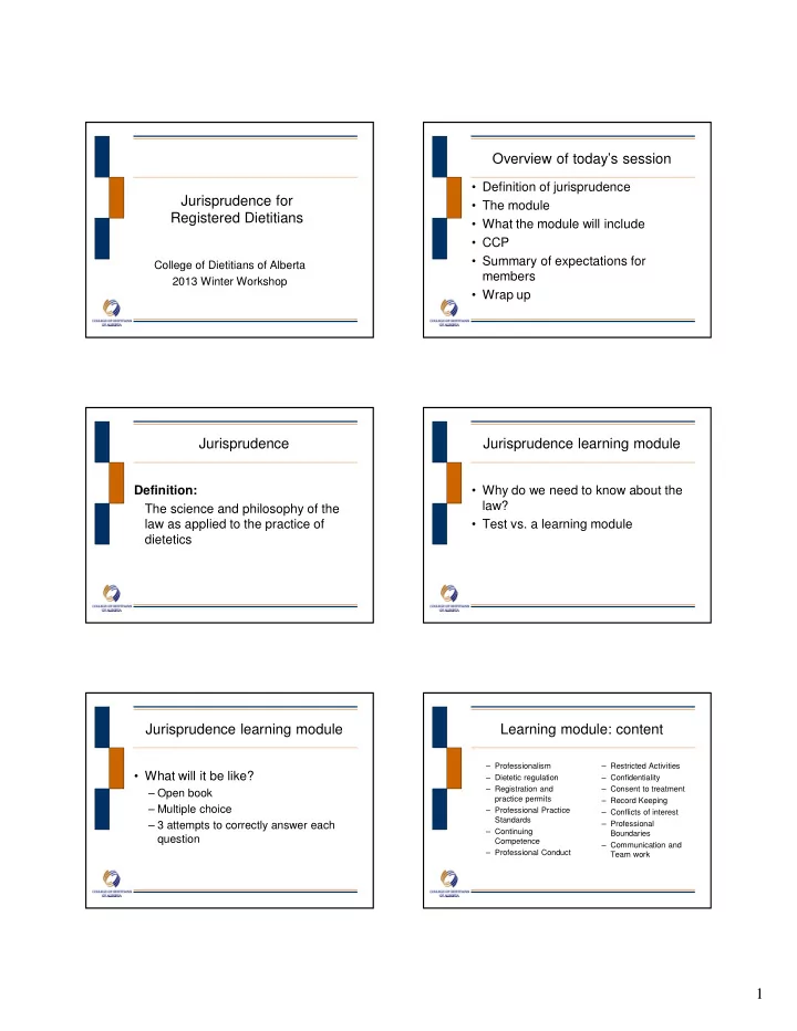 Overview of today’s session • Definition of jurisprudence Jurisprudence for • The module Registered Dietitians • What the module will include • CCP • Summary of expectations for College of Dietitians of Alberta members 2013 Winter Workshop • Wrap up Jurisprudence Jurisprudence learning module Definition: • Why do we need to know about the law? The science and philosophy of the law as applied to the practice of • Test vs. a learning module dietetics Jurisprudence learning module Learning module: content – Professionalism – Restricted Activities • What will it be like? – Dietetic regulation – Confidentiality – Registration and – Consent to treatment – Open book practice permits – Record Keeping – Multiple choice – Professional Practice – Conflicts of interest Standards – 3 attempts to correctly answer each – Professional – Continuing Boundaries question Competence – Communication and – Professional Conduct Team work 1