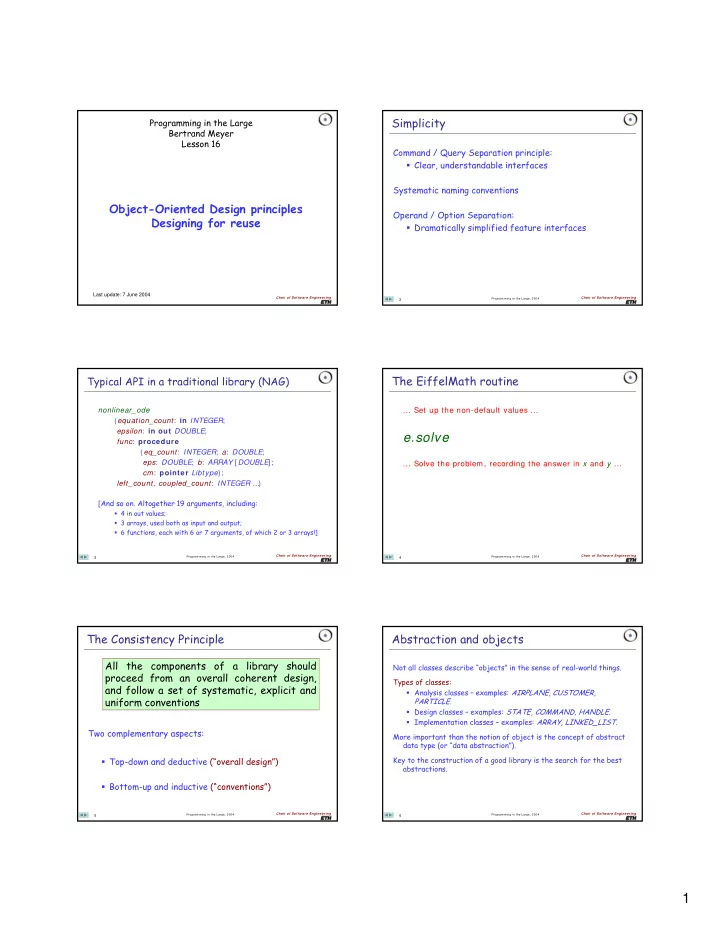 Simplicity Programming in the Large Bertrand Meyer Lesson 16 Command / Query Separation principle: � Clear, understandable interfaces Systematic naming conventions Object-Oriented Design principles Operand / Option Separation: Designing for reuse � Dramatically simplified feature interfaces Last update: 7 June 2004 Chair of Softw are Engineering Chair of Softw are Engineering Programming in the Large, 2004 2 The EiffelMath routine Typical API in a traditional library (NAG) nonlinear_ode ... Set up the non-default values ... ( equation_count : in INTEGER ; epsilon : in out DOUBLE ; e . solve func : procedure ( eq_count : INTEGER ; a : DOUBLE ; eps : DOUBLE ; b : ARRAY [ DOUBLE ] ; ... Solve the problem, recording the answer in x and y ... cm : pointer Libtype ); left_count , coupled_count : INTEGER … ) [And so on. Altogether 19 arguments, including: � 4 in out values; � 3 arrays, used both as input and output; � 6 functions, each with 6 or 7 arguments, of which 2 or 3 arrays!] Chair of Softw are Engineering Chair of Softw are Engineering 3 Programming in the Large, 2004 4 Programming in the Large, 2004 The Consistency Principle Abstraction and objects All the components of a library should Not all classes describe “objects” in the sense of real-world things. proceed from an overall coherent design, Types of classes: and follow a set of systematic, explicit and � Analysis classes – examples: AIRPLANE, CUSTOMER, uniform conventions PARTICLE. � Design classes – examples: STATE, COMMAND, HANDLE . � Implementation classes – examples: ARRAY, LINKED_LIST . Two complementary aspects: More important than the notion of object is the concept of abstract data type (or “data abstraction”). � Top-down and deductive (“overall design”) Key to the construction of a good library is the search for the best abstractions. � Bottom-up and inductive (“conventions”) Chair of Softw are Engineering Chair of Softw are Engineering 5 Programming in the Large, 2004 6 Programming in the Large, 2004 1