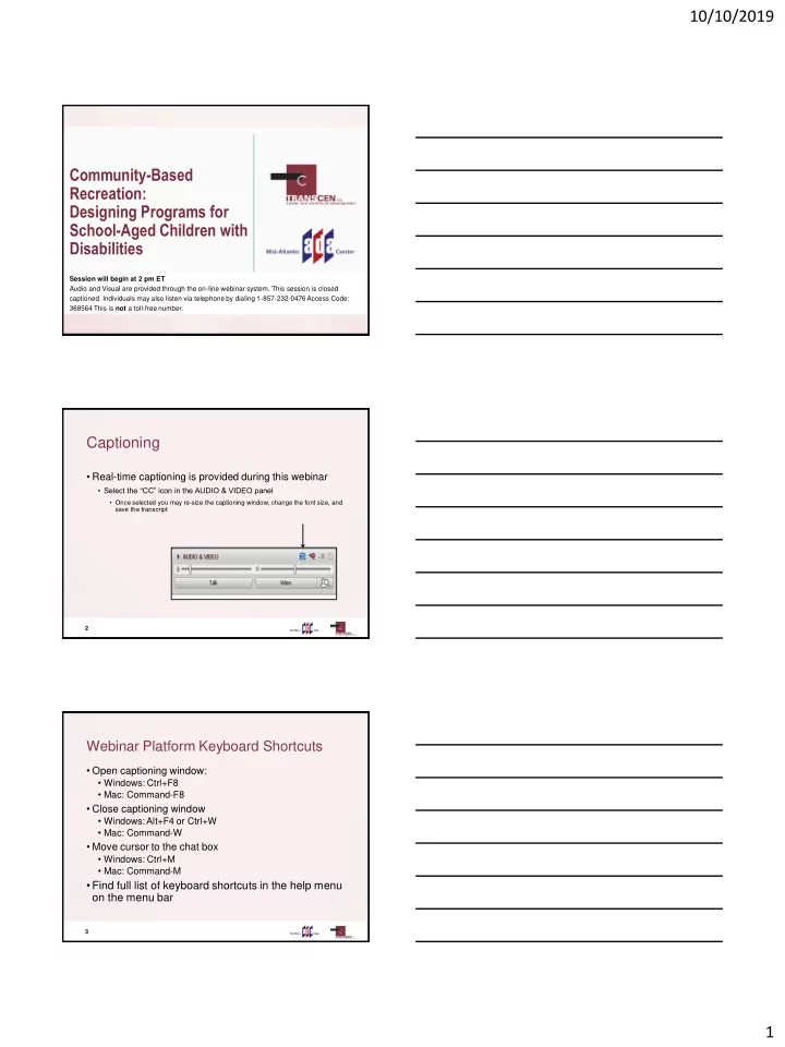 10/10/2019 Community-Based Recreation: Designing Programs for School-Aged Children with Disabilities Session will begin at 2 pm ET Audio and Visual are provided through the on-line webinar system. This session is closed captioned. Individuals may also listen via telephone by dialing 1-857-232-0476 Access Code: 368564 This is not a toll-free number. Captioning • Real-time captioning is provided during this webinar • Select the “CC” icon in the AUDIO & VIDEO panel • Once selected you may re-size the captioning window, change the font size, and save the transcript 2 Webinar Platform Keyboard Shortcuts • Open captioning window: • Windows: Ctrl+F8 • Mac: Command-F8 • Close captioning window • Windows: Alt+F4 or Ctrl+W • Mac: Command-W • Move cursor to the chat box • Windows: Ctrl+M • Mac: Command-M • Find full list of keyboard shortcuts in the help menu on the menu bar 3 1
