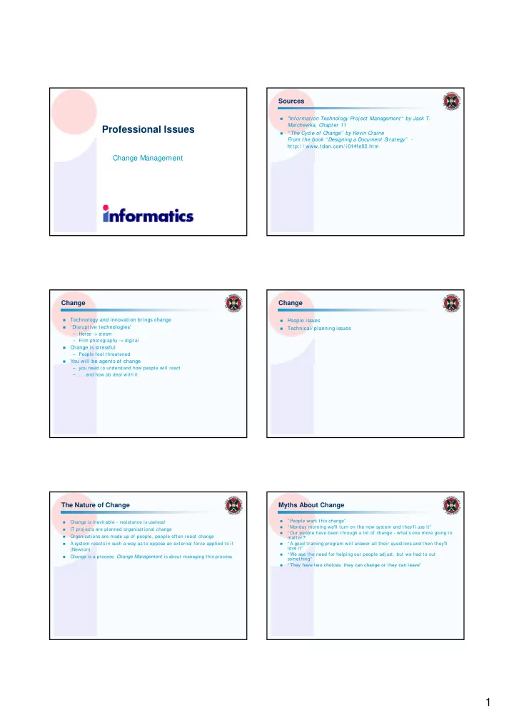 Sources "Informat ion Technology Proj ect Management “ by Jack T. Marchewka, Chapt er 11 Professional Issues “ The Cycle of Change” by Kevin Craine From t he book “ Designing a Document S t rat egy” - http:/ / www.tdan.com/ i014fe02.htm Change Management g g Change Change Technology and innovation brings change People issues ‘ Disruptive technologies’ Technical/ planning issues – Horse -> steam – Film photography -> digital Change is stressful – People feel threatened You will be agents of change g g – you need to understand how people will react – ... and how do deal with it The Nature of Change Myths About Change “ People want this change” Change is inevitable - resistance is useless! “ Monday morning we'll turn on the new system and they'll use it” IT proj ects are planned organisational change “ Our people have been through a lot of change - what's one more going to Organisations are made up of people, people often resist change matter? ” A system reacts in such a way as to oppose an external force applied to it “ A good training program will answer all their questions and then they'll love it” (Newton) “ We see the need for helping our people adj ust, but we had to cut Change is a process: Change Management is about managing this process something” “ They have two choices: they can change or they can leave” They have two choices: they can change or they can leave 1