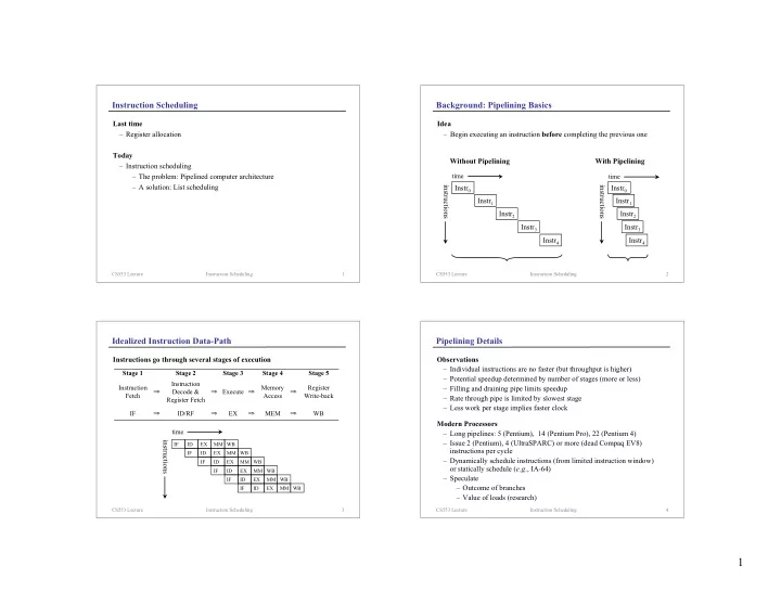Instruction Scheduling Background: Pipelining Basics Last time Idea – Register allocation – Begin executing an instruction before completing the previous one Today Without Pipelining With Pipelining – Instruction scheduling – The problem: Pipelined computer architecture time time – A solution: List scheduling Instr 0 Instr 0 instructions instructions Instr 1 Instr 1 Instr 2 Instr 2 Instr 3 Instr 3 Instr 4 Instr 4 CS553 Lecture Instruction Scheduling 1 CS553 Lecture Instruction Scheduling 2 Idealized Instruction Data-Path Pipelining Details Instructions go through several stages of execution Observations – Individual instructions are no faster (but throughput is higher) Stage 1 Stage 2 Stage 3 Stage 4 Stage 5 – Potential speedup determined by number of stages (more or less) Instruction Instruction Memory Register – Filling and draining pipe limits speedup Decode & Execute ⇒ ⇒ ⇒ ⇒ Fetch Access Write-back – Rate through pipe is limited by slowest stage Register Fetch – Less work per stage implies faster clock IF ID/RF EX MEM WB ⇒ ⇒ ⇒ ⇒ Modern Processors time – Long pipelines: 5 (Pentium), 14 (Pentium Pro), 22 (Pentium 4) instructions – Issue 2 (Pentium), 4 (UltraSPARC) or more (dead Compaq EV8) IF ID EX MM WB instructions per cycle IF ID EX MM WB – Dynamically schedule instructions (from limited instruction window) IF ID EX MM WB or statically schedule ( e.g ., IA-64) IF ID EX MM WB – Speculate IF ID EX MM WB – Outcome of branches IF ID EX MM WB – Value of loads (research) CS553 Lecture Instruction Scheduling 3 CS553 Lecture Instruction Scheduling 4 1