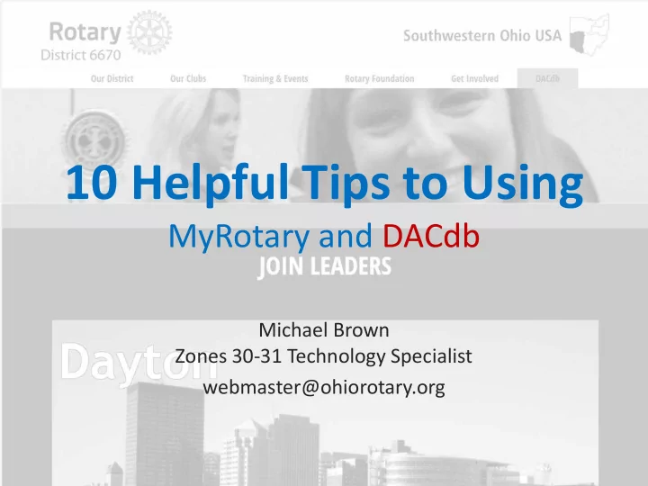 10 Helpful Tips to Using MyRotary and DACdb Michael Brown Zones 30-31 Technology Specialist webmaster@ohiorotary.org