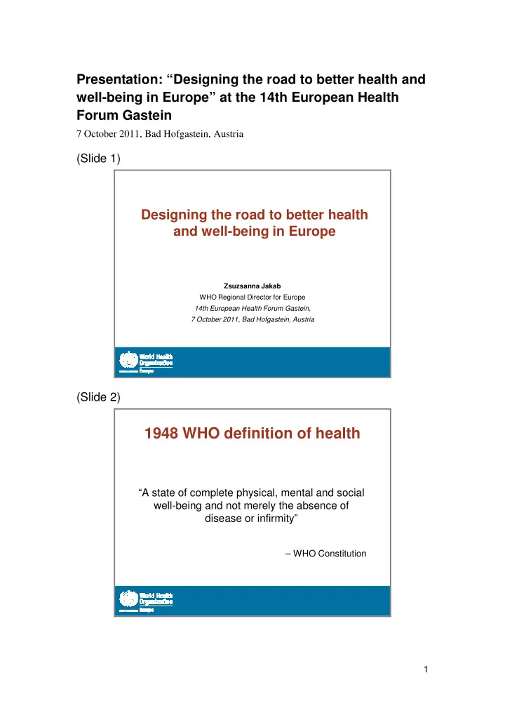 Presentation: “Designing the road to better health and well-being in Europe” at the 14th European Health Forum Gastein 7 October 2011, Bad Hofgastein, Austria (Slide 1) Designing the road to better health and well-being in Europe Zsuzsanna Jakab WHO Regional Director for Europe 14th European Health Forum Gastein, 7 October 2011, Bad Hofgastein, Austria (Slide 2) 1948 WHO definition of health “A state of complete physical, mental and social well-being and not merely the absence of disease or infirmity” – WHO Constitution 1