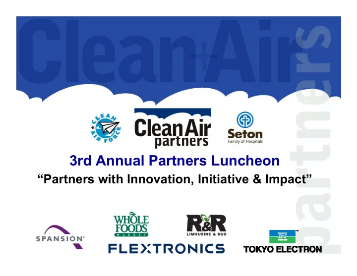 The Clean Air Partners Program A partnership of local businesses and employers committed to and working together for cleaner committed to and working together for cleaner air to keep Central Texas healthy and livable. Clean Air Partners commit to reducing 10% of their ozone+forming emissions within 3 years.