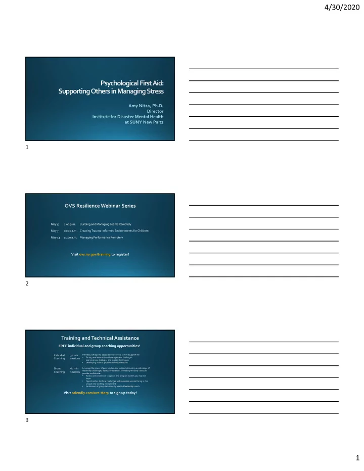 4/30/2020 1 May 5 1:00 p.m. Building and Managing Teams Remotely May 7 10:00 a.m. Creating Trauma-Informed Environments for Children May 13 11:00 a.m. Managing Performance Remotely Visit ovs.ny.gov/training to register! 2 FREE individual and group coaching opportunities! Individual 30 min Provides participants access to one-on-one, tailored support for: • Facing new leadership and management challenges Coaching sessions • Learning new strategies and support techniques • Developing realistic problem-solving measures Group 60 min Leverage the power of peer wisdom and support discussing a wide range of leadership challenges, especially as relates to leading remotely. Sessions Coaching sessions provide confidential: • Access and connection to agency and program leaders you may not know • Opportunities to share challenges and successes you are facing in this unique new working environment • Facilitation of group discussion by a skilled leadership coach Visit calendly.com/ovs-ttarp to sign up today! 3 1