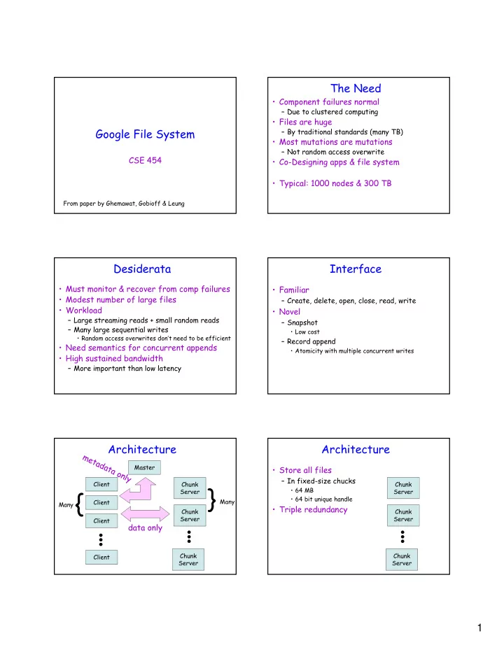 The Need • Component failures normal – Due to clustered computing • Files are huge Google File System – By traditional standards (many TB) • Most mutations are mutations – Not random access overwrite CSE 454 • Co-Designing apps & file system • Typical: 1000 nodes & 300 TB From paper by Ghemawat, Gobioff & Leung Desiderata Interface • Must monitor & recover from comp failures • Familiar • Modest number of large files – Create, delete, open, close, read, write • Workload • Novel – Large streaming reads + small random reads – Snapshot – Many large sequential writes • Low cost • Random access overwrites don’t need to be efficient – Record append • Need semantics for concurrent appends • Atomicity with multiple concurrent writes • High sustained bandwidth – More important than low latency Architecture Architecture metadata only Master • Store all files – In fixed-size chucks Client Chunk Chunk } { • 64 MB Server Server • 64 bit unique handle Many Client Many • Triple redundancy Chunk Chunk Server Server Client data only Chunk Chunk Client Server Server 1
