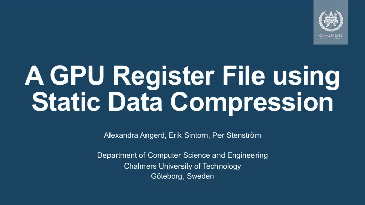 A GPU Register File using Static Data Compression Alexandra Angerd, Erik Sintorn, Per Stenström Department of Computer Science and Engineering Chalmers University of Technology Göteborg, Sweden