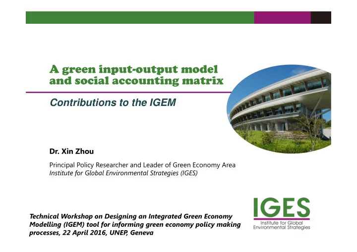 A green input-output model and social accounting matrix Contributions to the IGEM Dr. Xin Zhou Principal Policy Researcher and Leader of Green Economy Area Institute for Global Environmental Strategies (IGES) Technical Workshop on Designing an Integrated Green Economy Modelling (IGEM) tool for informing green economy policy making processes, 22 April 2016, UNEP , Geneva