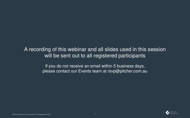 A recording of this webinar and all slides used in this session will be sent out to all registered participants If you do not receive an email within 5 business days, please contact our Events team at rsvp@pitcher.com.au 1 Pitcher Partners is an association of independent firms.