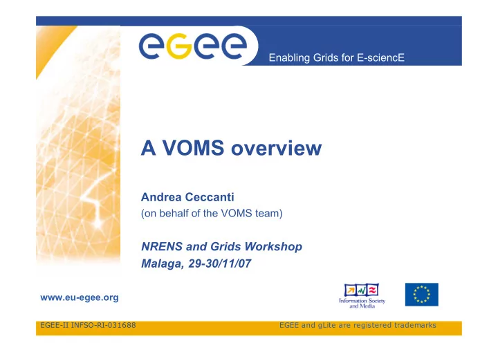 Enabling Grids for E-sciencE A VOMS overview Andrea Ceccanti (on behalf of the VOMS team) NRENS and Grids Workshop Malaga, 29-30/11/07 www.eu-egee.org EGEE-II INFSO-RI-031688 EGEE and gLite are registered trademarks