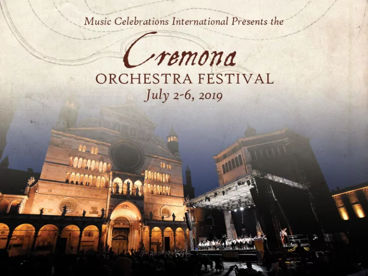 About the Festival Music Celebrations International in cooperation with the Cremona City Council and Chamber of Commerce welcome you and your ensemble to perform in the 2019 Cremona Orchestra Festival, an exclusive music event that will take place July 2 - 6, 2019! The 2019 Orchestra Festival will be part of the prestigious two-weeks long Cremona Music Festival. T wo or more select orchestras will be featured in performance in this historic city which is filled with musical history and craft. All participating orchestras are selected by application process through Music Celebrations. Known around the world for its tradition of stringed instrument production, Cremona has been a famous music center since the 16th century and still prides itself for its artisan workshops producing high- quality stringed instruments. Cremona’s finest resident luthier was Antonio Stradivari. It is estimated Stradivari produced over 1,000 instruments, of which only 650 survive today and are still some of the finest in the world. Highlights of Cremona include the Museo del Violino, a new museum which highlights the origins of the violin, violin construction, and Stradivari’s personal tools and drawings. The Civic Museum houses Italian paintings and artifacts from the middle ages through the 20th century . One cannot visit Cremona without a visit to the Duomo and Baptistery dating back to the early 12th-century . Milan and Busseto are just a short drive away to experience the grandeur of Italian art and culture and the hometown of famed composer Giuseppe V erdi.