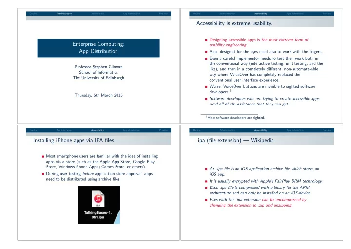 Outline Administration Accessibility App distribution Preview Outline Administration Accessibility App distribution Preview Accessibility is extreme usability. Designing accessible apps is the most extreme form of Enterprise Computing: usability engineering . App Distribution Apps designed for the eyes need also to work with the fingers. Even a careful implementor needs to test their work both in the conventional way (interactive testing, unit testing, and the Professor Stephen Gilmore like), and then in a completely di ff erent, non-automate-able School of Informatics way where VoiceOver has completely replaced the The University of Edinburgh conventional user interface experience. Worse, VoiceOver buttons are invisible to sighted software developers. † Thursday, 5th March 2015 Software developers who are trying to create accessible apps need all of the assistance that they can get. † Most software developers are sighted. Outline Administration Accessibility App distribution Preview Outline Administration Accessibility App distribution Preview Installing iPhone apps via IPA files .ipa (file extension) — Wikipedia Most smartphone users are familiar with the idea of installing apps via a store (such as the Apple App Store, Google Play Store, Windows Phone Apps+Games Store, or others). An .ipa file is an iOS application archive file which stores an During user testing before application store approval, apps iOS app. need to be distributed using archive files. It is usually encrypted with Apple’s FairPlay DRM technology. Each .ipa file is compressed with a binary for the ARM architecture and can only be installed on an iOS-device. Files with the .ipa extension can be uncompressed by changing the extension to .zip and unzipping.