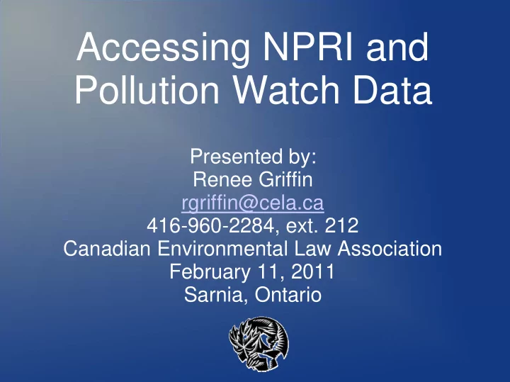 Accessing NPRI and Pollution Watch Data Presented by: Renee Griffin rgriffin@cela.ca 416-960-2284, ext. 212 Canadian Environmental Law Association February 11, 2011 Sarnia, Ontario