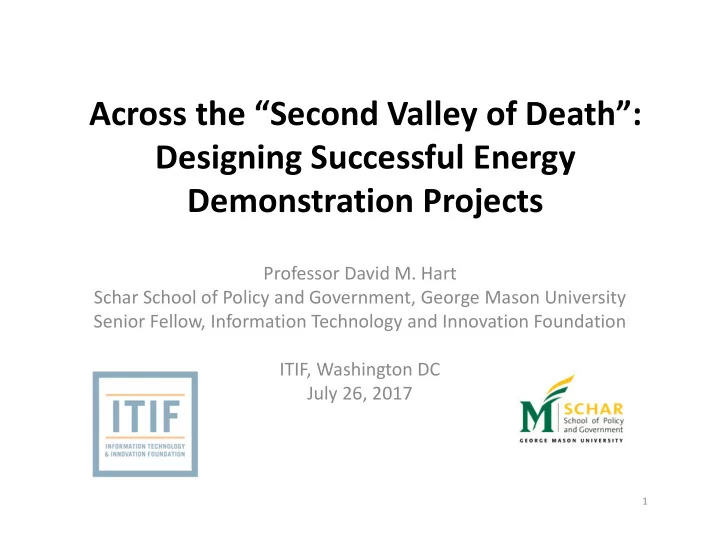 Across the “Second Valley of Death”: Designing Successful Energy Demonstration Projects Professor David M. Hart Schar School of Policy and Government, George Mason University Senior Fellow, Information Technology and Innovation Foundation ITIF, Washington DC July 26, 2017 1