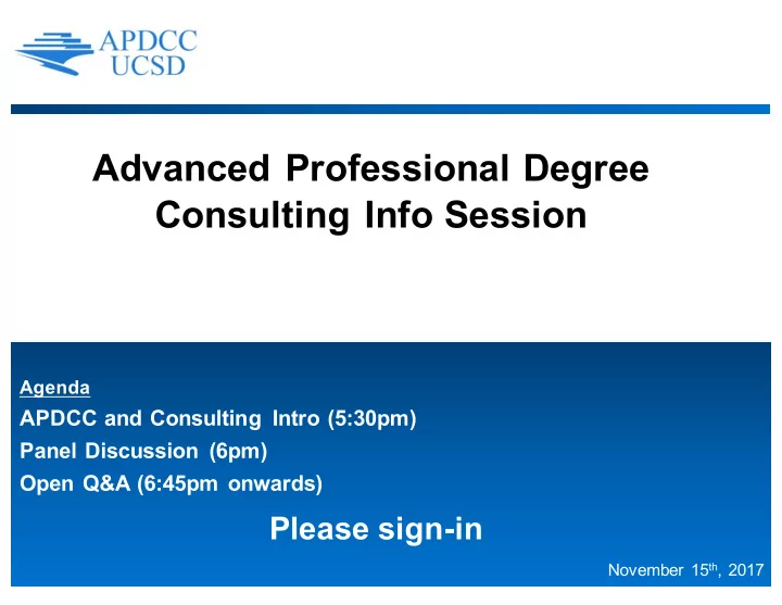 Advanced Professional Degree Consulting Info Session Agenda APDCC and Consulting Intro (5:30pm) Panel Discussion (6pm) Open Q&A (6:45pm onwards) Please sign-in November 15 th , 2017