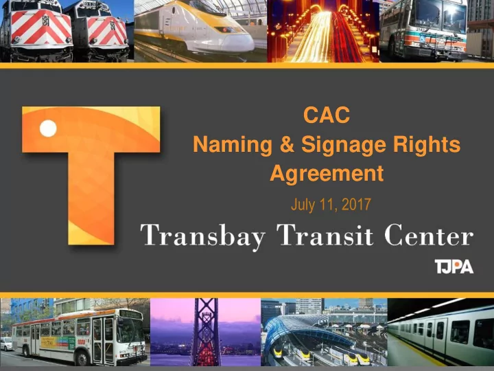 Recommendation Approve the Naming and Signage Rights Agreement to provide Salesforce the right to name the new Transit Center the “Salesforce Transit Center” and the right to receive certain other benefits over the course of a 25-year term. Approve a Memorandum of Agreement regarding Mission Square and a confidential First Amendment to Security Agreement between TJPA and Transbay Tower LLC regarding design of the plaza located at 415 Mission Street. 9