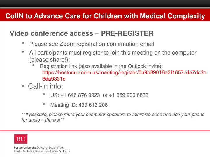 CoIIN to Advance Care for Children with Medical Complexity Video conference access – PRE-REGISTER Boston University Slideshow Title Goes Here • Please see Zoom registration confirmation email • All participants must register to join this meeting on the computer (please share!): • Registration link (also available in the Outlook invite): https://bostonu.zoom.us/meeting/register/0a9b89016a2f1657cde7dc3c 8da9331e ▪ Call-in info: • US: +1 646 876 9923 or +1 669 900 6833 • Meeting ID: 439 613 208 **If possible, please mute your computer speakers to minimize echo and use your phone for audio – thanks!**