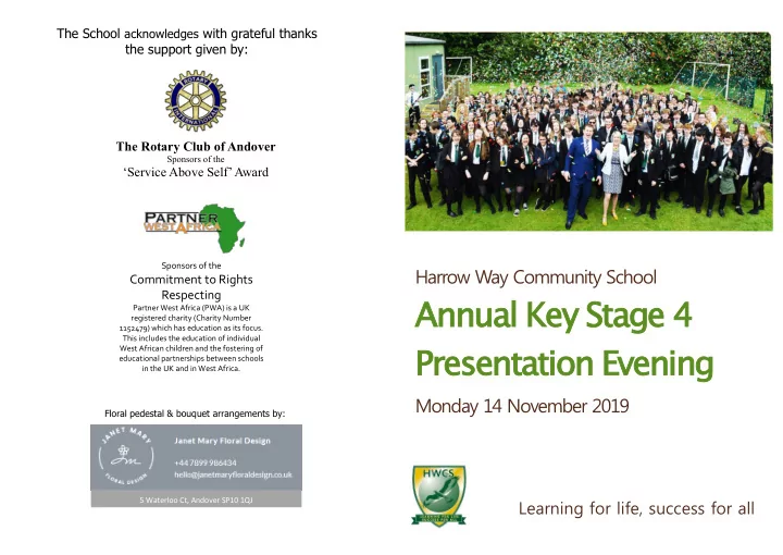 The School acknowledges with grateful thanks the support given by: The Rotary Club of Andover Sponsors of the ‘Service Above Self’ Award Sponsors of the Harrow Way Community School Commitment to Rights Respecting Annual Key Stage 4 Partner West Africa (PWA) is a UK registered charity (Charity Number 1152479) which has education as its focus. This includes the education of individual Presentation Evening West African children and the fostering of educational partnerships between schools in the UK and in West Africa. Monday 14 November 2019 Floral pedestal & bouquet arrangements by: Learning for life, success for all 5 Waterloo Ct, Andover SP10 1QJ