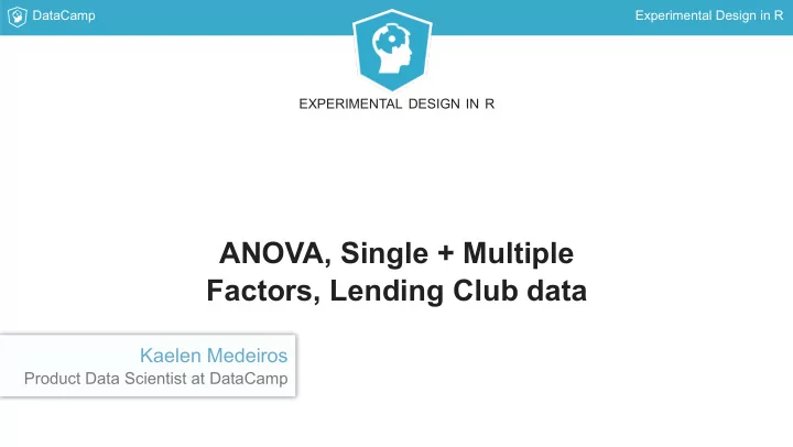 DataCamp Experimental Design in R EXPERIMENTAL DESIGN IN R ANOVA, Single + Multiple Factors, Lending Club data Kaelen Medeiros Product Data Scientist at DataCamp