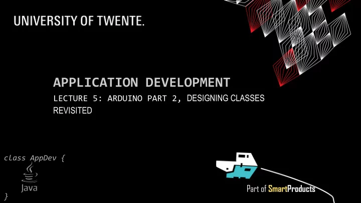APPLICATION DEVELOPMENT LECTURE 5: ARDUINO PART 2, DESIGNING CLASSES REVISITED class AppDev { Part of SmartProducts }