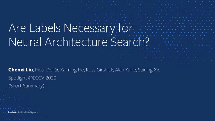 Are Labels Necessary for Neural Architecture Search? Chenxi Liu , Piotr Dollár, Kaiming He, Ross Girshick, Alan Yuille, Saining Xie Spotlight @ECCV 2020 (Short Summary)
