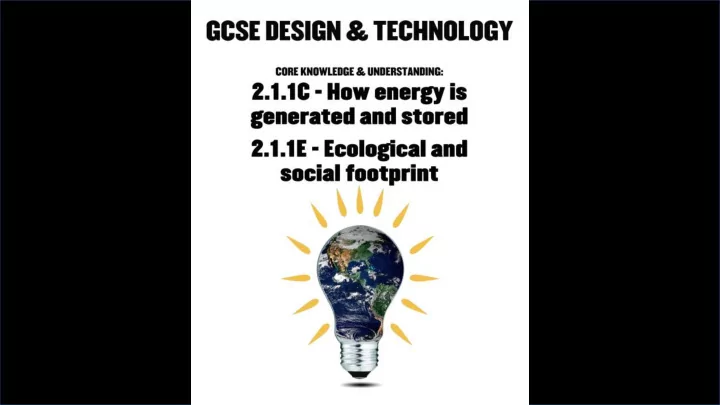 This section has been designed to You will learn about two develop your core knowledge and areas: understanding in design and technology and its impact on our daily lives. This will prepare you for designing How energy is generated and making your own products and and stored in order to also prepare you for the final assessments/examination. choose and use appropriate sources to make products & You will use your workbook The ecological and social during each theory lesson footprint of materials and to help you understand the components key areas shown in the box on the right…