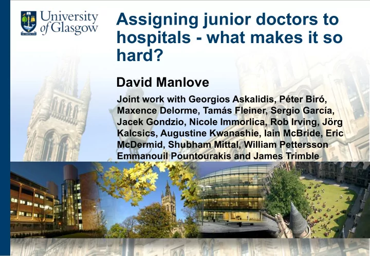 Assigning junior doctors to hospitals - what makes it so hard? David Manlove Joint work with Georgios Askalidis, Péter Biró, Maxence Delorme, Tamás Fleiner, Sergio García, Jacek Gondzio, Nicole Immorlica, Rob Irving, Jörg Kalcsics, Augustine Kwanashie, Iain McBride, Eric McDermid, Shubham Mittal, William Pettersson Emmanouil Pountourakis and James Trimble