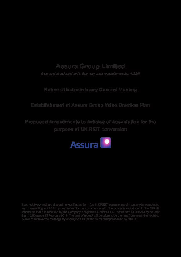 THIS DOCUMENT IS IMPORTANT AND REQUIRES YOUR IMMEDIATE ATTENTION. If you are in any doubt about the action you should take, you should immediately consult your independent financial adviser authorised under the Financial Services and Markets Act 2000. If you have sold or otherwise transferred all your shares in Assura Group Limited, please hand this document, but not the personalised form of proxy, to the purchaser or transferee, or to the bank, stockbroker or other agent through whom the sale or transfer was effected, for transmission to the purchaser or transferee. If you sell or have sold or otherwise transferred only part of your holding of existing shares please consult the bank, stockbroker or other agent through whom the sale or transfer was effected. Assura Group Limited (incorporated and registered in Guernsey under registration number 41230) Notice of Extraordinary General Meeting Establishment of Assura Group Value Creation Plan Proposed Amendments to Articles of Association for the purpose of UK REIT conversion Your attention is drawn to the letter from the Chairman of the Company which is set out on pages 1 to 3 of this document and which recommends you to vote in favour of the resolutions to be proposed at the Extraordinary General Meeting. Your attention is also drawn to the section entitled “Action to be taken” on page 3 of this document. Notice of an Extraordinary General Meeting of the Company to be held at the London offices of Addleshaw Goddard LLP at Milton Gate, 60 Chiswell Street, London EC1Y 4AG at 10.00am on 15 February 2013 is set out at the end of this document. Shareholders will find enclosed with this document a Form of Proxy for use in connection with the Extraordinary General Meeting. To be valid, the Form of Proxy should be completed, signed and returned in accordance with the instructions printed thereon, as soon as possible and, in any event, so as to reach the Company’s registrars, Computershare Investor Services Limited, whose address is The Pavilions, Bridgwater Road, Bristol BS99 6ZY, by no later than 10.00am on 13 February 2013. If you hold your ordinary shares in uncertificated form (i.e. in CREST) you may appoint a proxy by completing and transmitting a CREST proxy instruction in accordance with the procedures set out in the CREST Manual so that it is received by the Company’s registrars (under CREST participant ID 3RA50) by no later than 10.00am on 13 February 2013. The time of receipt will be taken to be the time from which the registrar is able to retrieve the message by enquiry to CREST in the manner prescribed by CREST. Completion and return of a Form of Proxy or completion and transmission of a CREST proxy instruction will not preclude shareholders from attending and voting at the Extraordinary General Meeting should they choose to do so. Further instructions relating to the Form of Proxy, and proxy appointment and instruction through CREST, are set out in the EGM notice on page 31.