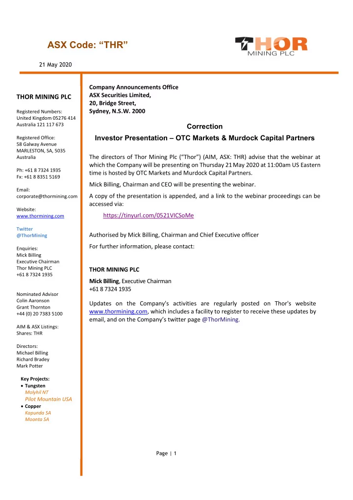 ASX Code: “THR” 21 May 2020 Company Announcements Office ASX Securities Limited, THOR MINING PLC 20, Bridge Street, Sydney, N.S.W. 2000 Registered Numbers: United Kingdom 05276 414 Australia 121 117 673 Correction Investor Presentation – OTC Markets & Murdock Capital Partners Registered Office: 58 Galway Avenue MARLESTON, SA, 5035 The directors of Thor Mining Plc (“Thor”) (AIM, ASX: THR) advise that the webinar at Australia which the Company will be presenting on Thursday 21 May 2020 at 11:00am US Eastern Ph: +61 8 7324 1935 time is hosted by OTC Markets and Murdock Capital Partners. Fx: +61 8 8351 5169 Mick Billing, Chairman and CEO will be presenting the webinar. Email: A copy of the presentation is appended, and a link to the webinar proceedings can be corporate@thormining.com accessed via: Website: https://tinyurl.com/0521VICSoMe www.thormining.com Twitter Authorised by Mick Billing, Chairman and Chief Executive officer @ThorMining For further information, please contact: Enquiries: Mick Billing Executive Chairman Thor Mining PLC THOR MINING PLC +61 8 7324 1935 Mick Billing , Executive Chairman +61 8 7324 1935 Nominated Advisor Colin Aaronson Updates on the Company's activities are regularly posted on Thor's website Grant Thornton www.thormining.com, which includes a facility to register to receive these updates by +44 (0) 20 7383 5100 email, and on the Company’s twitter page @ThorMining. AIM & ASX Listings: Shares: THR Directors: Michael Billing Richard Bradey Mark Potter Key Projects: • Tungsten Molyhil NT Pilot Mountain USA • Copper Kapunda SA Moonta SA Page | 1