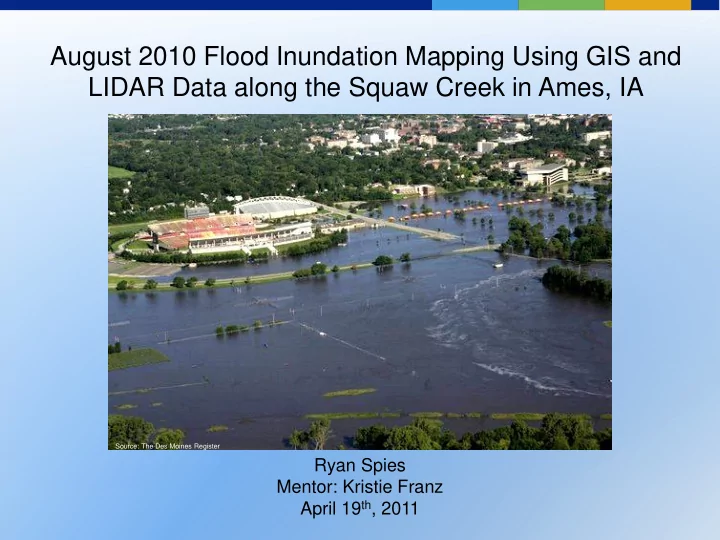 August 2010 Flood Inundation Mapping Using GIS and LIDAR Data along the Squaw Creek in Ames, IA Source: The Des Moines Register Ryan Spies Mentor: Kristie Franz April 19 th , 2011