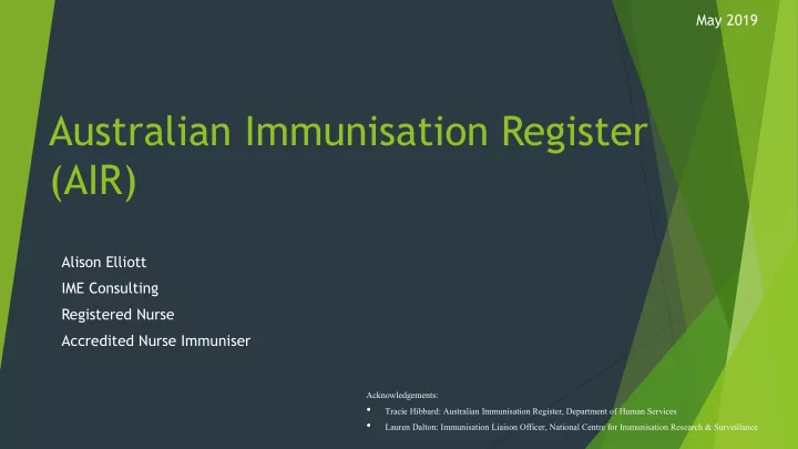 May 2019 Australian Immunisation Register (AIR) Alison Elliott IME Consulting Registered Nurse Accredited Nurse Immuniser Acknowledgements: • Tracie Hibbard: Australian Immunisation Register, Department of Human Services • Lauren Dalton: Immunisation Liaison Officer, National Centre for Immunisation Research & Surveillance