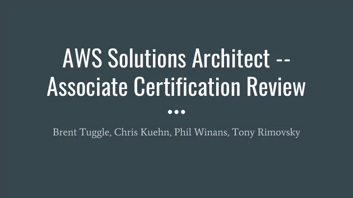 AWS Solutions Architect -- Associate Certification Review Brent Tuggle, Chris Kuehn, Phil Winans, Tony Rimovsky