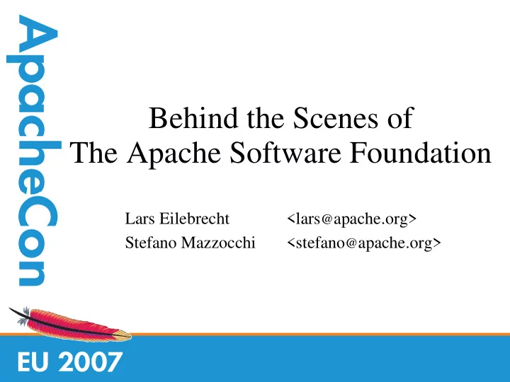 Behind the Scenes of The Apache Software Foundation Lars Eilebrecht <lars @ apache.org> Stefano Mazzocchi <stefano @ apache.org>