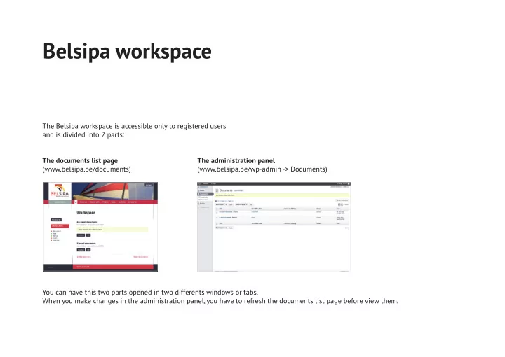 Belsipa workspace The Belsipa workspace is accessible only to registered users and is divided into 2 parts: The documents list page The administration panel (www.belsipa.be/documents) (www.belsipa.be/wp-admin -> Documents) You can have this two parts opened in two differents windows or tabs. When you make changes in the administration panel, you have to refresh the documents list page before view them.