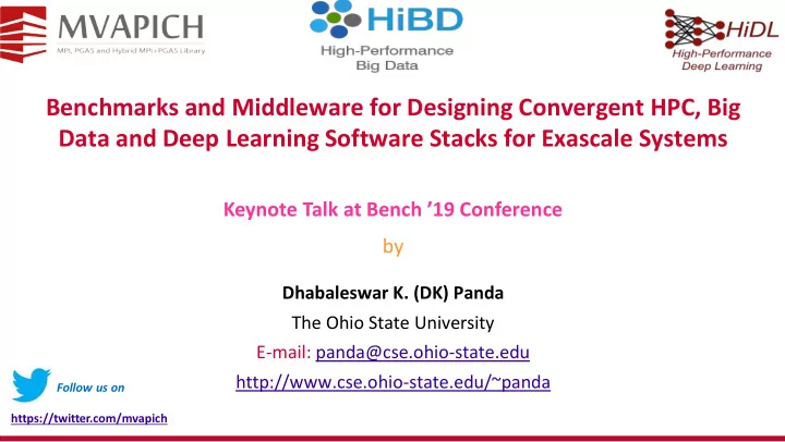 Benchmarks and Middleware for Designing Convergent HPC, Big Data and Deep Learning Software Stacks for Exascale Systems Keynote Talk at Bench ’19 Conference by Dhabaleswar K. (DK) Panda The Ohio State University E-mail: panda@cse.ohio-state.edu http://www.cse.ohio-state.edu/~panda Follow us on https://twitter.com/mvapich