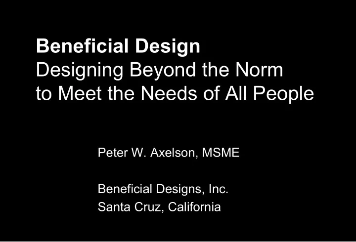 Beneficial Design Designing Beyond the Norm to Meet the Needs of All People Peter W. Axelson, MSME Beneficial Designs, Inc. Santa Cruz, California