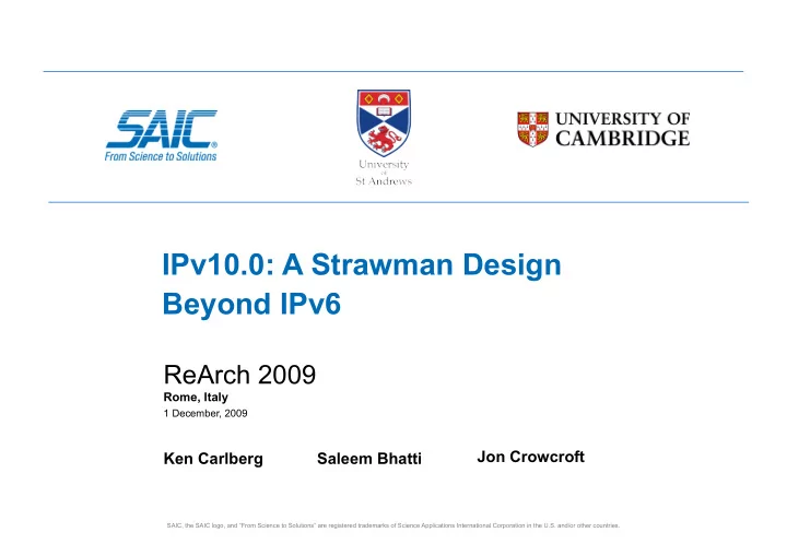 IPv10.0: A Strawman Design Beyond IPv6 ReArch 2009 Rome, Italy 1 December, 2009 Jon Crowcroft Ken Carlberg Saleem Bhatti SAIC, the SAIC logo, and “From Science to Solutions” are registered trademarks of Science Applications International Corporation in the U.S. and/or other countries.
