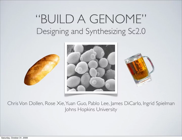 “BUILD A GENOME” Designing and Synthesizing Sc2.0 Chris Von Dollen, Rose Xie, Yuan Guo, Pablo Lee, James DiCarlo, Ingrid Spielman Johns Hopkins University Saturday, October 31, 2009