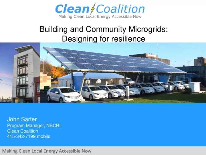 Building and Community Microgrids: Designing for resilience John Sarter Program Manager, NBCRI Clean Coalition 415-342-7199 mobile Making Clean Local Energy Accessible Now