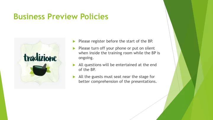 Business Preview Policies Please register before the start of the BP . Please turn off your phone or put on silent when inside the training room while the BP is ongoing. All questions will be entertained at the end of the BP . All the guests must seat near the stage for better comprehension of the presentations.