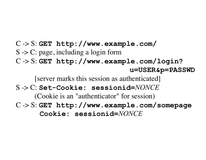 C -> S: GET http://www.example.com/ S -> C: page, including a login form C -> S: GET http://www.example.com/login? u=USER&p=PASSWD [server marks this session as authenticated] S -> C: Set-Cookie: sessionid= NONCE (Cookie is an "authenticator" for session) C -> S: GET http://www.example.com/somepage Cookie: sessionid= NONCE