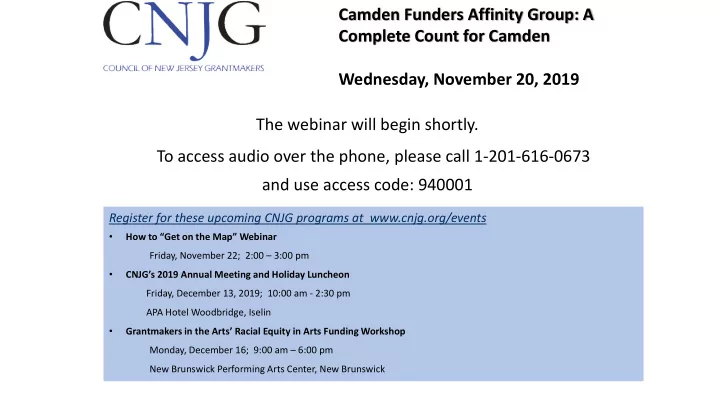 Camden Funders Affinity Group: A Complete Count for Camden Wednesday, November 20, 2019 The webinar will begin shortly. To access audio over the phone, please call 1-201-616-0673 and use access code: 940001 Register for these upcoming CNJG programs at www.cnjg.org/events • How to “Get on the Map” Webinar Friday, November 22; 2:00 – 3:00 pm • CNJG’s 2019 Annual Meeting and Holiday Luncheon Friday, December 13, 2019; 10:00 am - 2:30 pm APA Hotel Woodbridge, Iselin • Grantmakers in the Arts’ Racial Equity in Arts Funding Workshop Monday, December 16; 9:00 am – 6:00 pm New Brunswick Performing Arts Center, New Brunswick