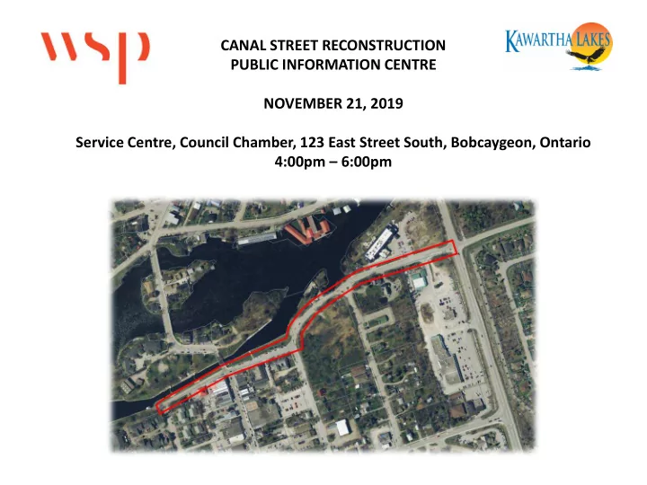 CANAL STREET RECONSTRUCTION PUBLIC INFORMATION CENTRE NOVEMBER 21, 2019 Service Centre, Council Chamber, 123 East Street South, Bobcaygeon, Ontario 4:00pm – 6:00pm Source: Flash Earth