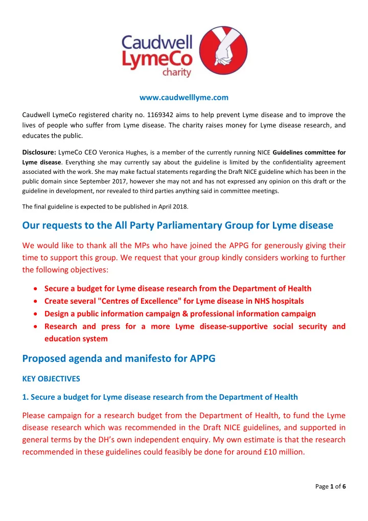 www.caudwelllyme.com Caudwell LymeCo registered charity no. 1169342 aims to help prevent Lyme disease and to improve the lives of people who suffer from Lyme disease. The charity raises money for Lyme disease research, and educates the public. Disclosure: LymeCo CEO Veronica Hughes, is a member of the currently running NICE Guidelines committee for Lyme disease . Everything she may currently say about the guideline is limited by the confidentiality agreement associated with the work. She may make factual statements regarding the Draft NICE guideline which has been in the public domain since September 2017, however she may not and has not expressed any opinion on this draft or the guideline in development, nor revealed to third parties anything said in committee meetings. The final guideline is expected to be published in April 2018. Our requests to the All Party Parliamentary Group for Lyme disease We would like to thank all the MPs who have joined the APPG for generously giving their time to support this group. We request that your group kindly considers working to further the following objectives: Secure a budget for Lyme disease research from the Department of Health Create several "Centres of Excellence" for Lyme disease in NHS hospitals Design a public information campaign & professional information campaign Research and press for a more Lyme disease-supportive social security and education system Proposed agenda and manifesto for APPG KEY OBJECTIVES 1. Secure a budget for Lyme disease research from the Department of Health Please campaign for a research budget from the Department of Health, to fund the Lyme disease research which was recommended in the Draft NICE guidelines, and supported in gene ral terms by the DH’s own independent enquiry. My own estimate is that the research recommended in these guidelines could feasibly be done for around £10 million. Page 1 of 6
