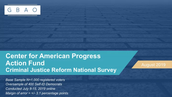 Center for American Progress Action Fund August 2019 Criminal Justice Reform National Survey Base Sample N=1,000 registered voters Oversample of 400 Self-ID Democrats Conducted July 8-15, 2019 online Margin of error = +/- 3.1 percentage points