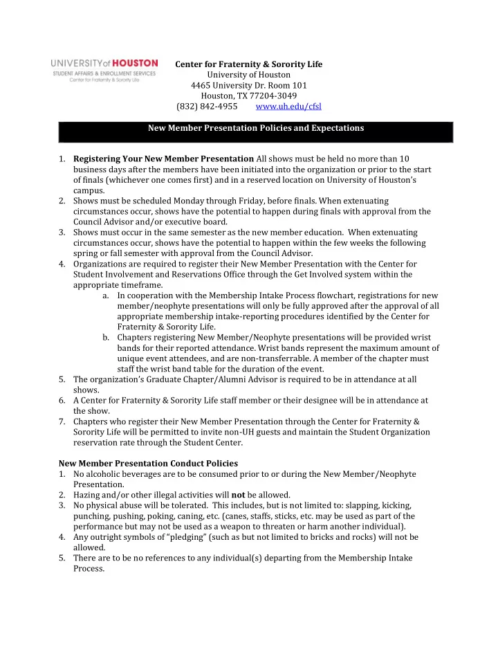 Center for Fraternity & Sorority Life University of Houston 4465 University Dr. Room 101 Houston, TX 77204-3049 (832) 842-4955 www.uh.edu/cfsl New Member Presentation Policies and Expectations 1. Registering Your New Member Presentation All shows must be held no more than 10 business days after the members have been initiated into the organization or prior to the start of finals (whichever one comes first) and in a reserved location on University o f Houston’s campus. 2. Shows must be scheduled Monday through Friday, before finals. When extenuating circumstances occur, shows have the potential to happen during finals with approval from the Council Advisor and/or executive board. 3. Shows must occur in the same semester as the new member education. When extenuating circumstances occur, shows have the potential to happen within the few weeks the following spring or fall semester with approval from the Council Advisor. 4. Organizations are required to register their New Member Presentation with the Center for Student Involvement and Reservations Office through the Get Involved system within the appropriate timeframe. a. In cooperation with the Membership Intake Process flowchart, registrations for new member/neophyte presentations will only be fully approved after the approval of all appropriate membership intake-reporting procedures identified by the Center for Fraternity & Sorority Life. b. Chapters registering New Member/Neophyte presentations will be provided wrist bands for their reported attendance. Wrist bands represent the maximum amount of unique event attendees, and are non-transferrable. A member of the chapter must staff the wrist band table for the duration of the event. 5. The organization’s Graduate Chapter/Alumni Advisor is required to be in attendance at all shows. 6. A Center for Fraternity & Sorority Life staff member or their designee will be in attendance at the show. 7. Chapters who register their New Member Presentation through the Center for Fraternity & Sorority Life will be permitted to invite non-UH guests and maintain the Student Organization reservation rate through the Student Center. New Member Presentation Conduct Policies 1. No alcoholic beverages are to be consumed prior to or during the New Member/Neophyte Presentation. 2. Hazing and/or other illegal activities will not be allowed. 3. No physical abuse will be tolerated. This includes, but is not limited to: slapping, kicking, punching, pushing, poking, caning, etc. (canes, staffs, sticks, etc. may be used as part of the performance but may not be used as a weapon to threaten or harm another individual). 4. Any outright symbols of “pledging” (such as but not limited to bricks and rocks) will not be allowed. 5. There are to be no references to any individual(s) departing from the Membership Intake Process.