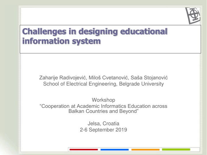 Challenges in designing educational information system Zaharije Radivojević, Miloš Cvetanović, Saša Stojanović School of Electrical Engineering, Belgrade University Workshop “Cooperation at Academic Informatics Education across Balkan Countries and Beyond” Jelsa, Croatia 2-6 September 2019